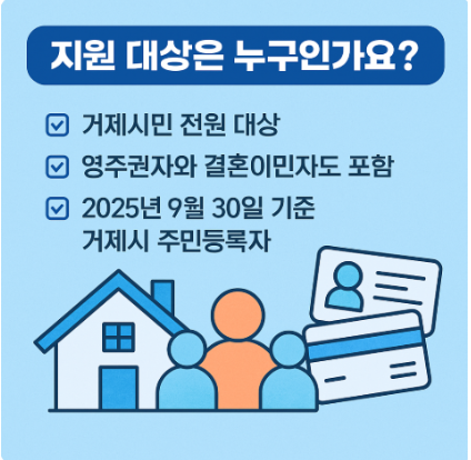 지원 대상은 2025년 9월 30일 기준 거제시에 주민등록이 되어 있는 전 시민입니다.